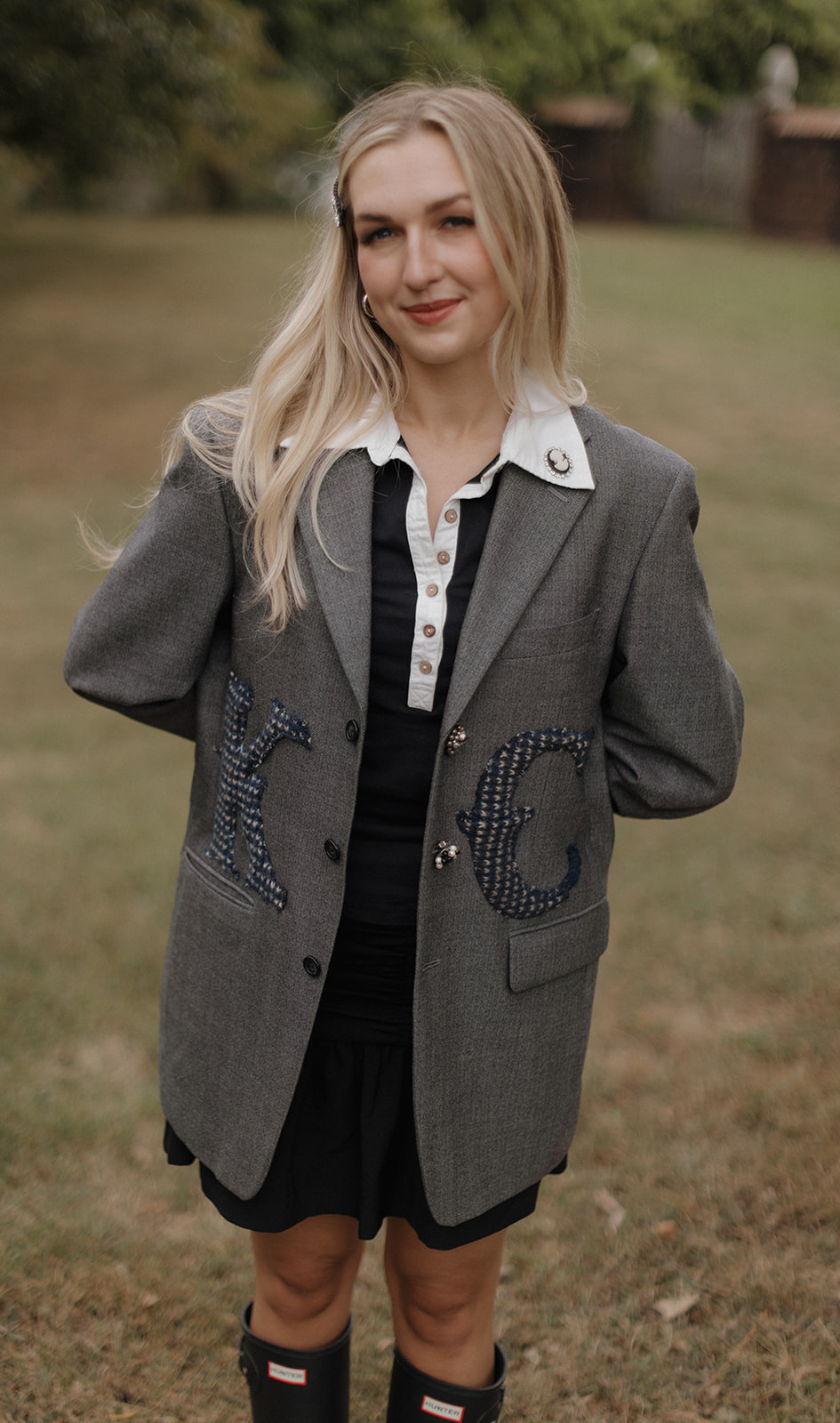 Gray blazer with navy blue and white lettering.
